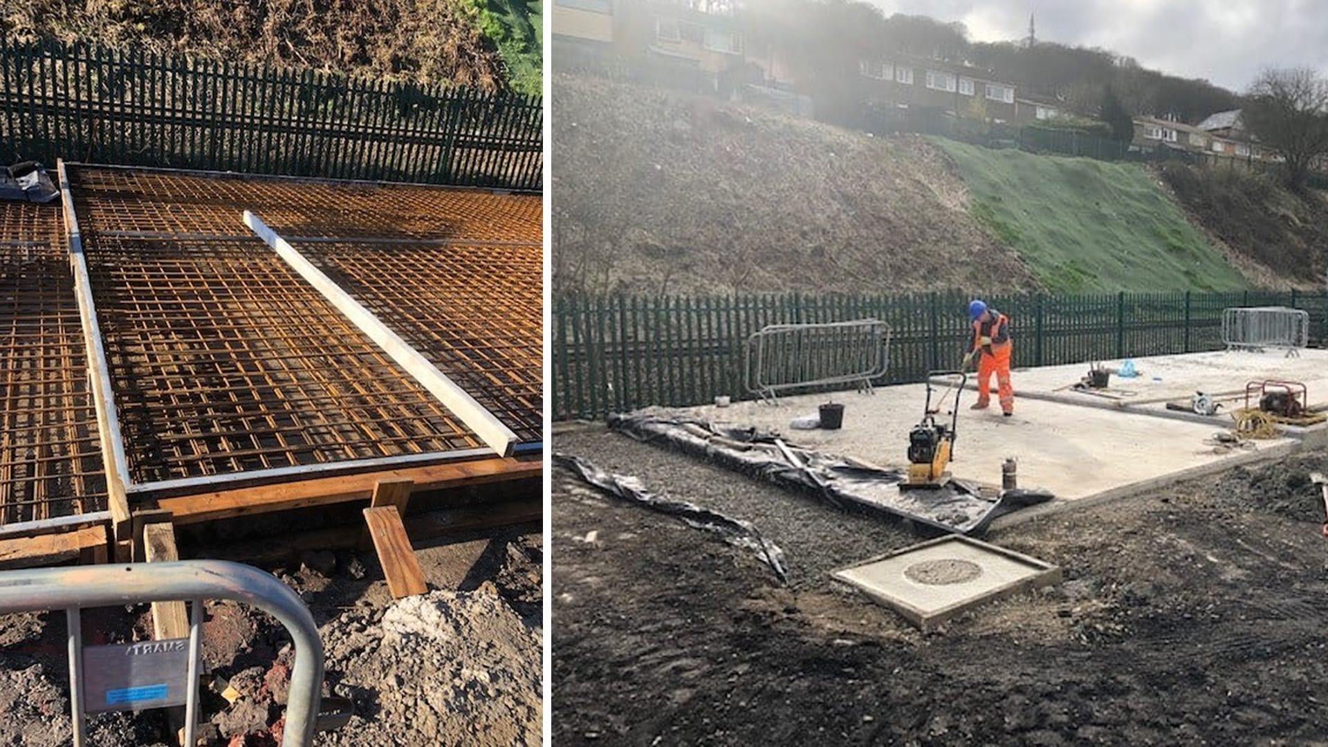 Once the ground was stabilised, a reinforced slab of around 60mÂł was constructed, complete with sealed drainage incorporating two gullies and chambers.